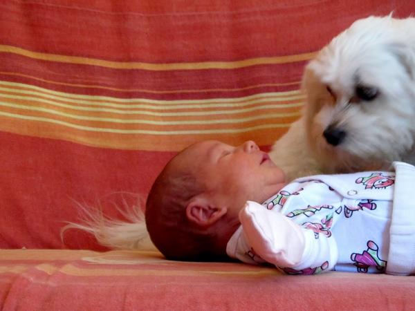 @bubinko1506 my sme niekde čítali, že má sa zobrať plienka od novorodenca a dať psom onuchať. tak ja som tak po drahom poslala "darček" našim psom. ked sme prišli domov z pôrodnice tak obe mu hned strčili nufáky k zadočku a vedeli, že tú vônu poznajú. malému zatiaľ nič neurobili, mladšia ho aj strážila kým bol maličký, staršia ho nejako neriešila, a teraz ked k nej príde malý tak sa zdvihne a odíde, ona nikdy k deťom vzťah nemala. ale zasa ked malý niečo žuje tak to sú najväčší kamoši lebo im dáva všetko čo a on je. často krát malého nájdem ako je natrepaný s nimi v pelechu alebo leží na tej mladšej. tá si nechá všetko.