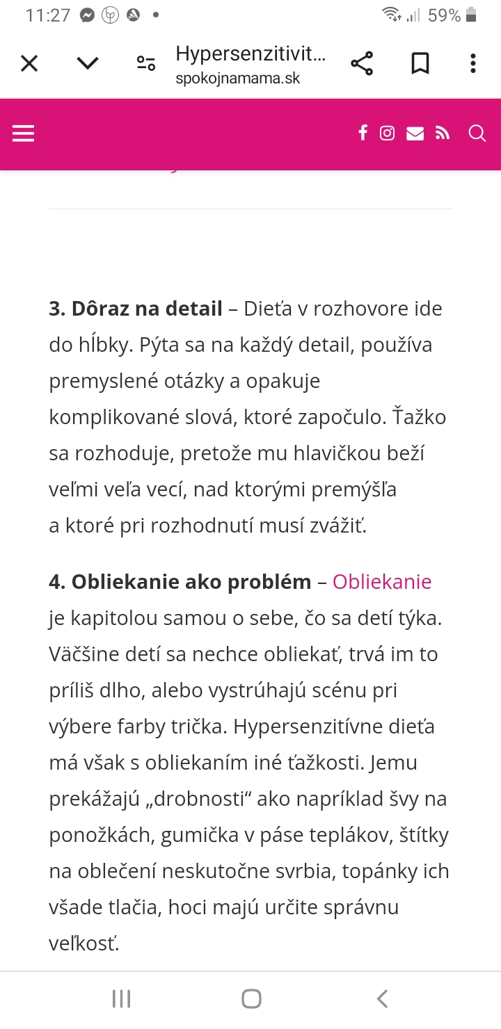 Snáď ako začal rozprávať jeho ,,bolia,, topánky ok povedala som si tak malé ,veľké ,mäkké,širšie , bez šnúrou,so šnúrkami 🤯 no keď vám poviem ,že bol 10 pár topánok dobrý nepreháňam .A to nie tak ,že v obchode vyskúšali ale kúpili a potom ho začali tlačiť. Nemôže mať zapravené tričko ,tielko .Štítky musia byť odstrihnuté ,,správne,, . Tepláky nenosí lebo ho bolia .Takto by som mohla pokračovať do rána . Verte mi,že sme už skúšali všetko stále rovnako .S manželom je to predmetom nedorozumení. On len dookola opakuje .že je rozmaznanÿ ,že je to žiadosť o pozornosť . Ja som už čítala všetko možné o vysokocitlivých deťoch v tomto smere. Fakt ma už bolí žalúdok keď si predstavím ako sa máme vypraviť vonku …a kúpa nového sezónneho oblečenia je pre mňa hororový zážitok