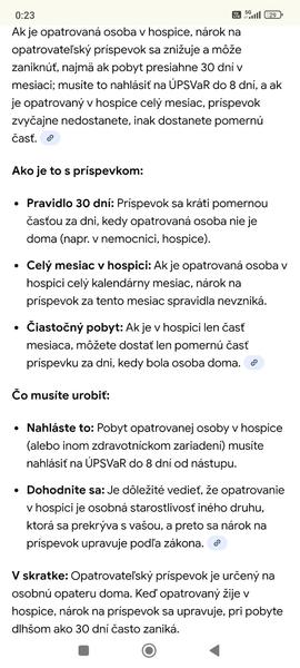 @janulienka144 vieš čo moja dcérka bola zdravotne postihnuta a ked bola v nemocnici kratil sa mi neviem ale myslím že ked je aj v hospici tak po mesiaci jej opatrovateľský podľa mna nedostaneš. Menilo sa to moja dcérka už nežije teraz bolo 6 rokov. Ale myslim že ak sa fyzický o nu nestaraš tak nárok asi zanika ja si tak myslim.Ak je v nemoci do 14 dni tak sa krati viem že na polovicu ale ked sa nestaraš celý mesiac nedostaneš podľa mna nič.Opýtaj sa radšej ale myslím že je to tak aj ked je v hospici.