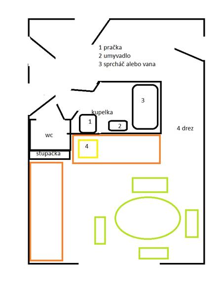Rozvody vody mas kde? Hlavne treba vediet kde je kanalizacia, lebo kupelna, WC aj odpad z drezu by mali byt umiestnene tak, aby odpad a splasky odtekali samospadom. Drez aj umyvadlo, pracka a umyvacka sa daju riesit aj odpadovym cerpadlom (celkom neprakticke) ale WC je najlepsie splachovat rovno do vertikalneho zvodu kanalizacie.