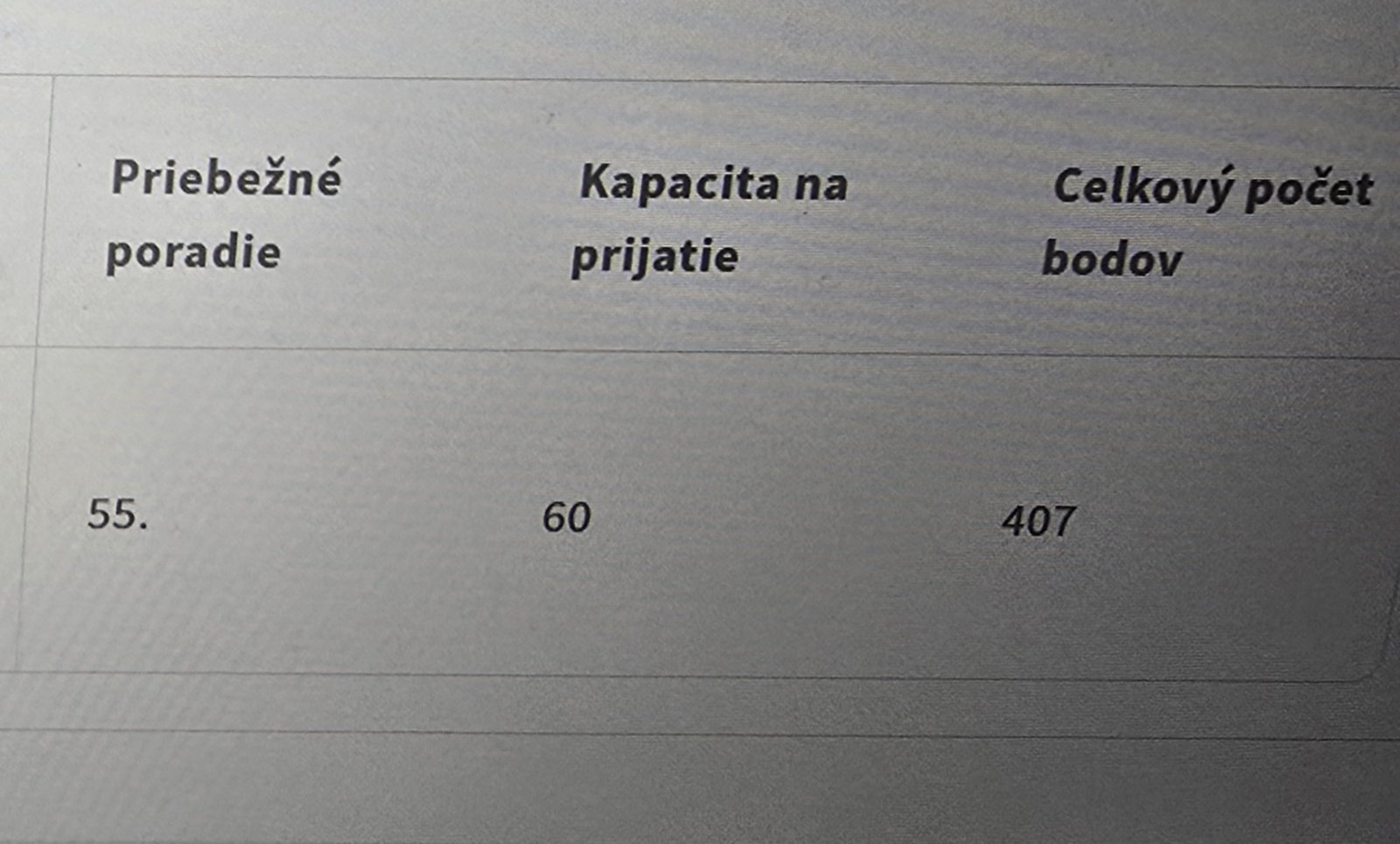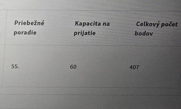 Teraz cakas na ostatnych ci urobili skusky inde a ak ano a mali prioritu na inej skole a prijmu ich tak sa posunie poradie tvojho dieta vyssie na jeho prioritnej skole. V minulosti ked si bola pod ciarou tak si dala odvolanie a cakala ci tie deti ktore mali v zalohe inu skolu nastupili tam a uvolnili miesto na vasej skole. Bolo to podobne len nezautomatizovane.