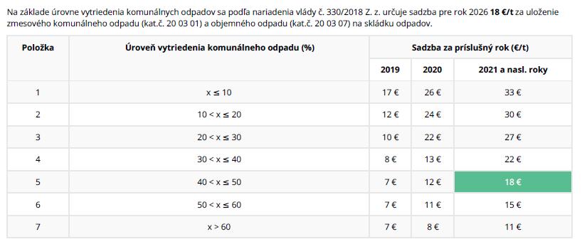 sadzba pre rok 2026 18 €/t za uloženie zmesového komunálneho odpadu