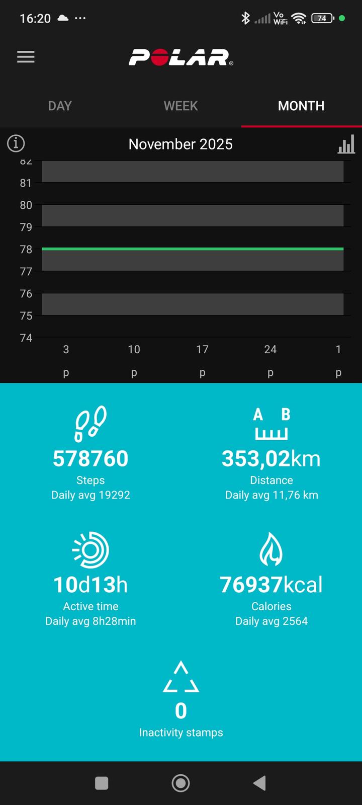@beronsche samozrejme, ja pešo chodím hodne. Nemám potrebu na lazoch - alebo na dedine, štartovať auto, v meste dokonca využívam záchytné parkovisko. Vieš akú to má výhodu? Dostanem sa všade rýchlejšie a nemusím sa hádať tými, čo už pomaly aj zabúdajú na čo tie nohy maju. Vo fotke máš môj denný priemer - v polke decembra mi malý rozbil hodinky - takže posielam november.