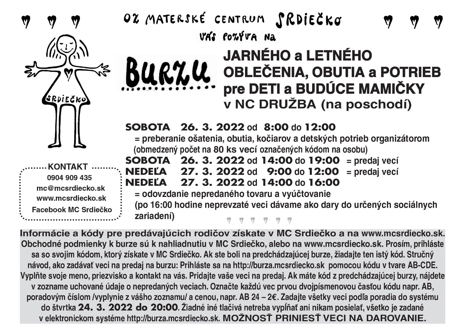 Ahojte, materské centrum Srdiečko v Trenčíne usporiada na konci marca burzu detského oblečenia, potrieb, veci pre tehotné, hračiek a veľa iného. Môže si nakúpiť, predať alebo oboje naraz.Viac informácií nájdete na plagátiku 😊