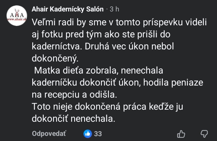 @anonym_4c2228 nebila som na mobile pozerala som sa takze tak ale ja nebudem strihat miesto kadernicky za to si ju olatim aby ju dobre ostrihala to ci ma dieta na rukach alebo ma vlasy v cioe jenuolne jedno ked idem ku kadernicke a mam coo tiez mi da dole gumicku ona napr ked mi ide rovit s vlasmi