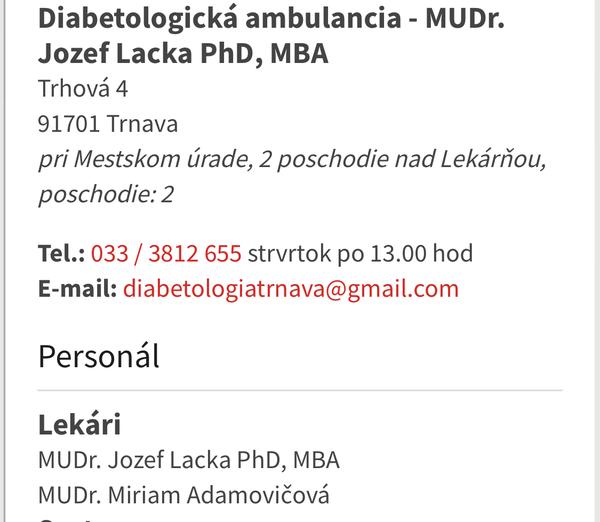 Ahojte, prosim Vas existuje realny kontakt na Mudr.Lacku, diabetolog v Trnave. Lebo na webe som nasla same neexistujuce čísla.