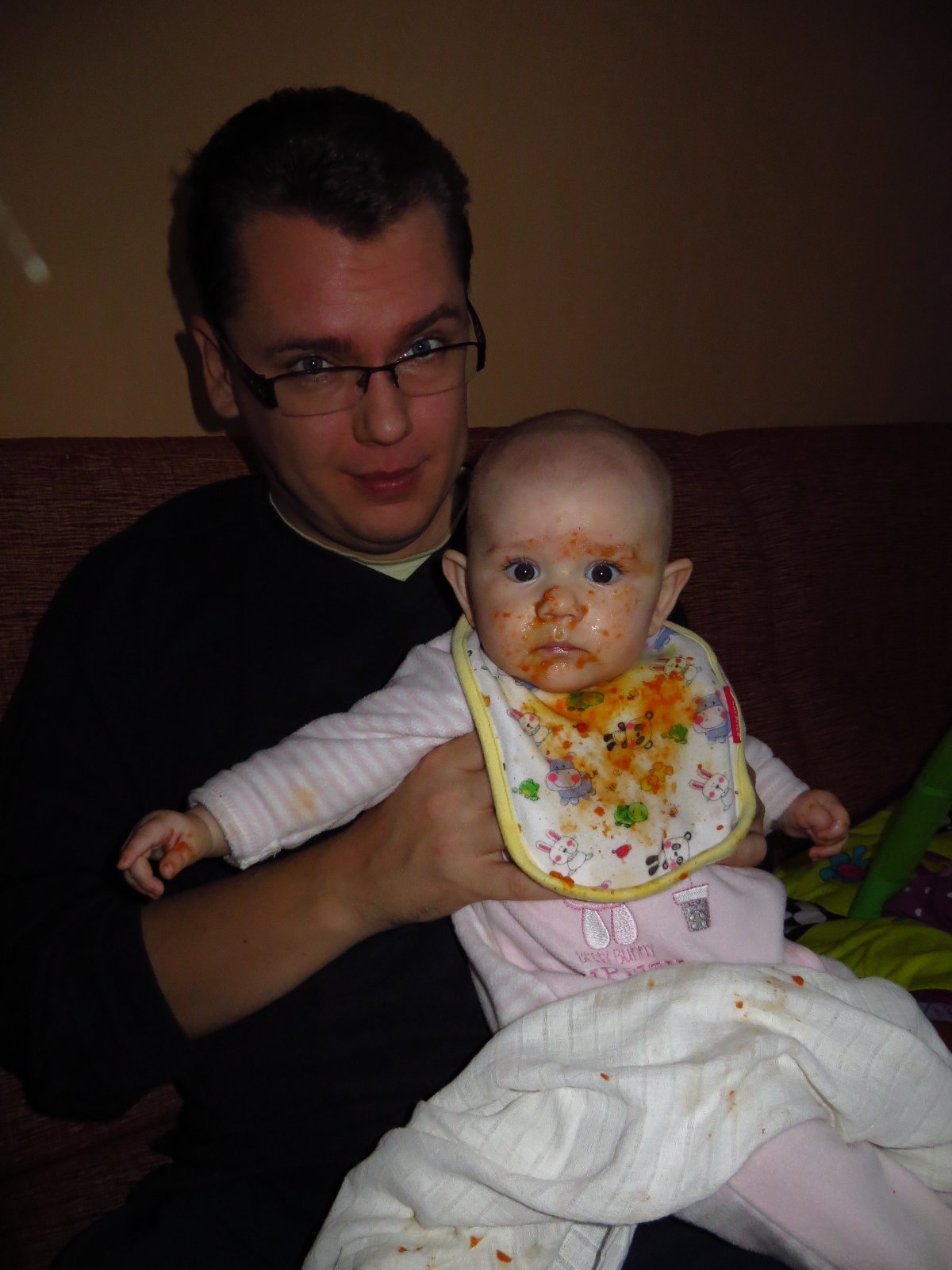Olivia papka spenat so zemiakom a je to velka srada. Skoda, ze som neodfotila, ked som raz poprosila manzela, aby strazil malu na nocniku, ze o chvilu pridem. Samozrejme pri nej na zemi zaspal, lebo bol po nocnej a ked som sa vratila, boli obaja ponatierani hovienkom, zem, koberec, babika. Poviem vam, to bol pohlad. Myslela som, ze ich oboch hodim do pracky. Ale bupi mi pomohol, tak ako vzdy.