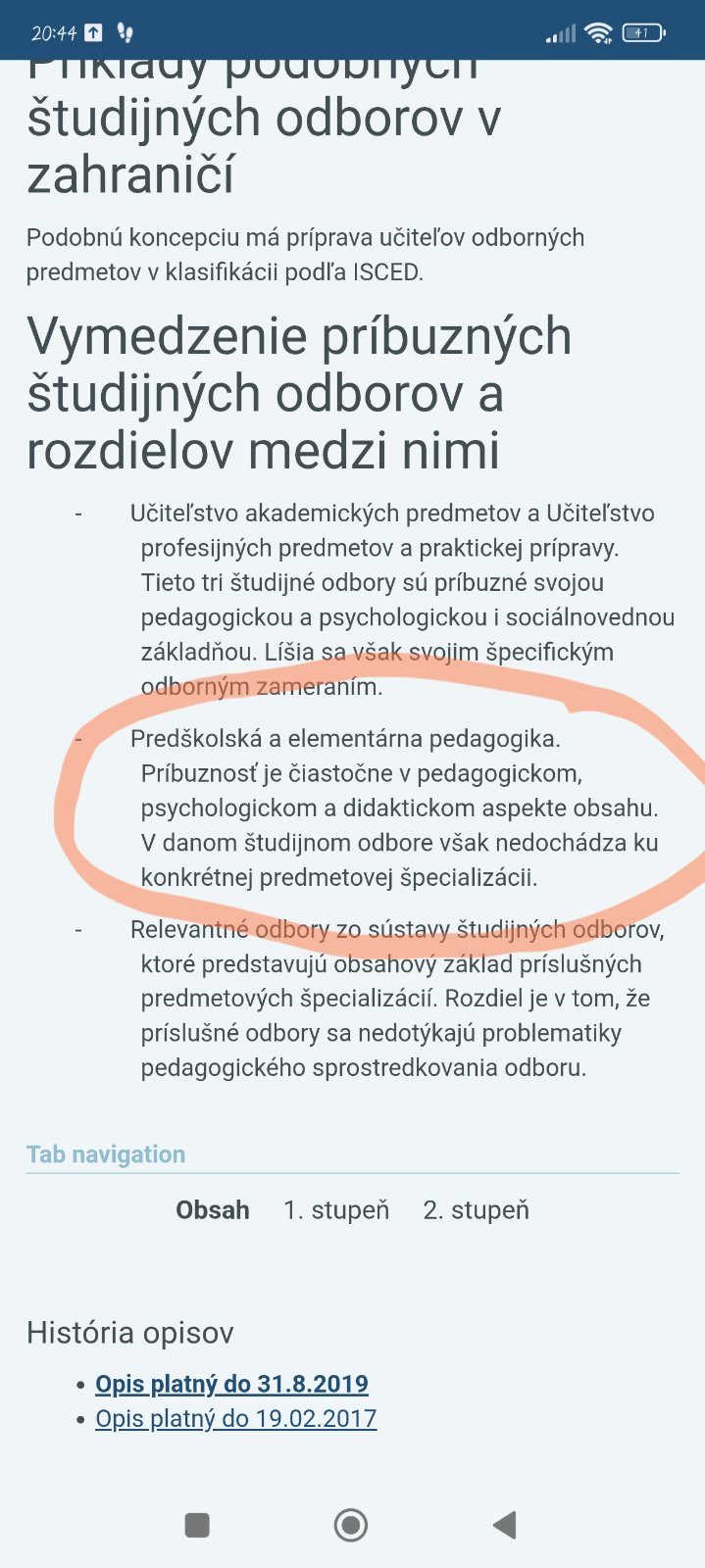 @slamkasalamka pocuvaj ma, ja som si tvoj odbor prekukla na nete,ze v ktorej kategorii ho mas zaradený. Nemyslím to v zlom, ale ked si z toho vystudovala Mgr. mala by si vediet, že je to odbor zaradeny do kat. Učiteľstvo a pedagogické vedy a teda ty NEPOTREBUJES DPS! Určite ťa zoberú na 2 ročné rozširujúce studium predprimarnej pedagogiky (studuje sa to len na vysokej skole !) a po ukonceni budes zaradena do platovej triedy prislúchajúcej Mgr. titulu. Ani nevymyslaj s dps alebo strednou pg. Totalne by si sa degradovala. Ty uz teraz mozes robit aj vychovavatelku alebo pg. asistenta a ked si urobis rozsirujuce , napr. v RK na KU tak si v pohode za dva roky kvalifikovana ucitelka ms s moznym platovym rastom.
