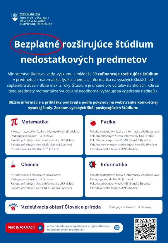 je tu niekto z učiteľov na ZŠ, ktorí si podali alebo budú podávať prihlášku na rozširujúce štúdium informatiky (UK, TU, UMB, UPJŠ) na akademický rok 25/26? Je to bezplatné štúdium na 2 roky, externe, financované ministerstvom s cieľom, aby predmety ako fyzika, informatika, matematika, chémia boli vyučované naozaj odborne. Prihlášky treba poslať do 31.8.