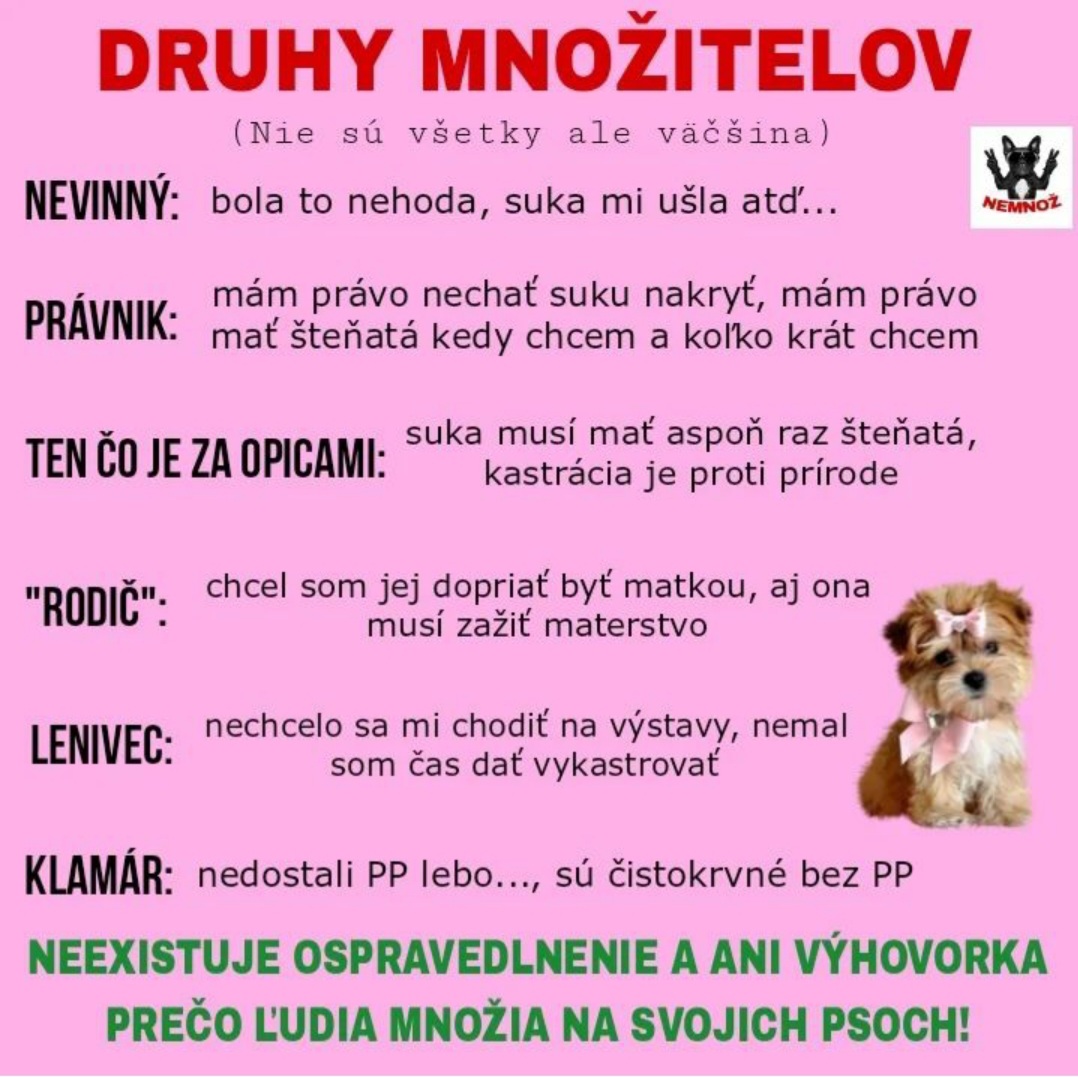 @lilope keby si čítala s porozumenim, tak si prečítaš, ze sme mali psíka z útulku, bol nájdený aj so svojím súrodencom priviazaný o strom v lese na kľaku vo veku približne 8 týždňov, takže tiež tam bol odsúdený na smrť a nebyť pani ktorá ich nasla, tak tam zamrznu, keďže to bolo koncom januára... Netvrdím, ze je niečo čierne alebo biele, ale jednoducho, keď ide niekto kúpiť psíka bez papierov, tak podporuje mnozitelov a je úplne jedno, ze ich množí doma na gauči, stále je to mnozitelov, akurát sučka ma lepší život ako tie, ich majú niekoľko v pivnici a nedávajú im poriadne jest a pit
