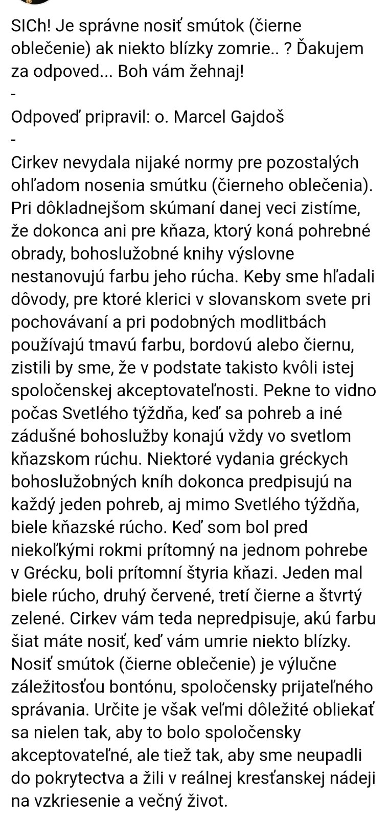 @suptdi Sobáš sa môže v kostole lebo je to sviatosť a zvyk nosenia čierneho je čisto spoločenská záležitosť s cirkevnými predpismi to nemá vôbec nič.Prikladám odpoveď grkat. kňaza na túto tému.Hlavne na dedinách sa to považuje prejav úcty k zosnulým ale mne príde úctivejšie sa za zosnulých modliť.Navyše mnohým ľudom to nosenie čiernej nerobí dobre a zhoršuje im to už aj tak dosť ťažký psychický stav.Alebo podľa teba by človek po smrti blízkeho mal skončiť na antidepresívach kvôli čiernym šatám? Lebo citlivé povahy to vie ozaj veľmi deprimovať.