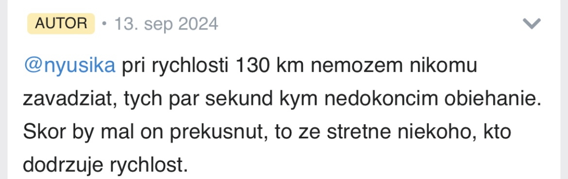 autorka ty tak splietas... normalne teba by presvedcilo az to, ze na dialnici po predvedeni tvojej jazdy a jazdy nas co s tebou nesuhlasia, fasnes pokutu od policie ty a ne my... normalne debata o nicom lebo s tebou nesuhlasia ludia..neskutocne