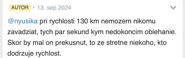 Tak ja neviem, raz píšeš jedno auto, potom 3-4 kamióny, raz ti to trvá pár sekúnd, inokedy sa nemáš kde zaradiť a preto tam zotrvávaš dlhšie. Raz píšeš, že ideš 120, potom 130. Raz píšeš, že za tebou nikto nešiel, potom, že situáciu za sebou nesleduješ, že to nie je tvoja povinnosť. Raz píšeš, že ty začínaš prvá obiehací manéver, potom, že za tebou musí auto spomaliť, lebo ho obmedzuješ (on nezačal obiehací manéver pred tebou?). Trváš na tom, že pravý pruh je pre pomalé autá/kamiony, preto v ňom nejazdíš, potom píšeš, že pri obiehacom manévri zabrzdíš, čím vedome ohrozuješ premávku, ale vinu chceš hádzať na vodiča za sebou. Tvrdíš, že diaľnica je pre všetkých, ale stále si ideš len JA, JA, JA. A kde sú pom tí ostatní, pre ktorých je diaľnica a vedia na nej jazdiť?