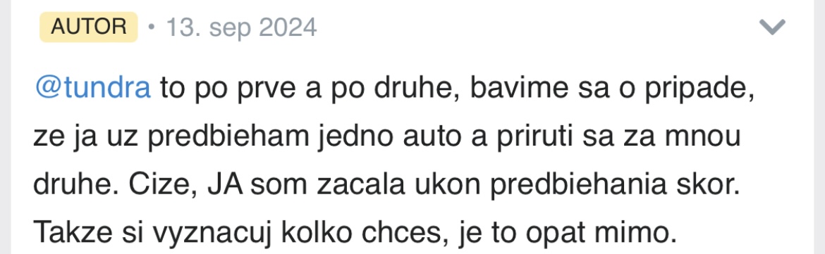 Ešte raz ti tu pridávam, čo si sama napísala… jedno auto, pár sekúnd… A to ešte nepoukazujem na iné veci, ktoré evidentne ako neskúsený vodič nevieš/neovládaš.