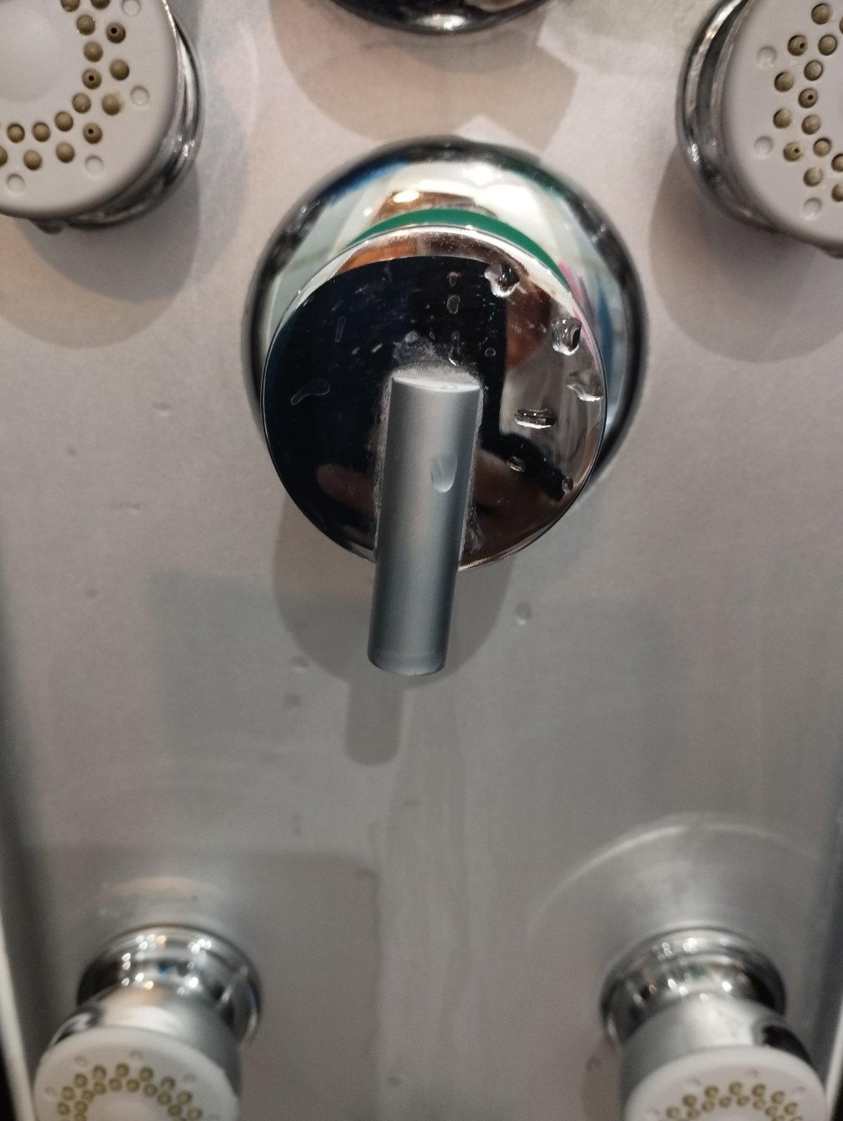 To je vonkajsia (zahradna) solarna sprcha? A to co kvapka je ventil (bateria, ovladaci prvok), ktorym pustas vodu do tych sprchovych hlavic? Je to otacacie (jediny ventil na jedinu vodu), alebo ako pakova bateria, ze si nastavujes pomer studenej a zohriatej vody aj prietok/mnozstvo? Ta "hrdza" vyzera skor ako vodny kamen - mozno z toho neustaleho kvapkania?