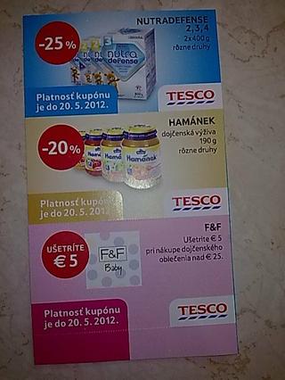 Potom kupóny zo zľavovej 50 bodovej knižky marec a apríl 2012, okrem kupónov na 25 % zľava na jeden výrobok, 5% na celý nákup, C&A, Dove šampón/kondicionér, Neutrogena, tel. mlieko, Gliss Kur, balsam na vlasy).