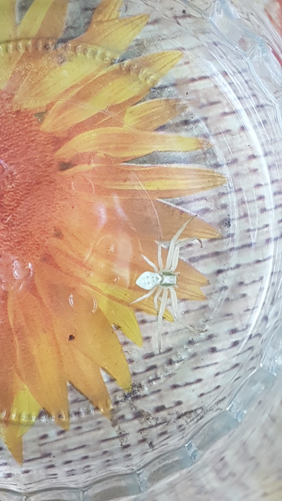 Asi ste ho priniesli s nejakymi kvetmi. Sedi na kvete a striehne na hmyz, preto ma take roztiahnute predne nohy. Nelovi v pavucine.
