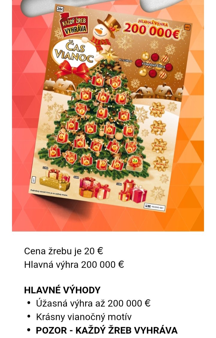 V tom vianočnom žrebe za 20 Eur je zaručená vyhra 10 Eur.