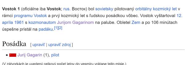 @pimpa12 asi myslela toto "Fakta o prvním pilotovaném letu do vesmíru byla překrucována do té míry, že například až deset let po Gagarinově letu vyšlo najevo, že nepřistál ve své lodi, ale samostatně po katapultáži. Tak důležitý byl pro sověty oficiální rekord zaregistrovaný FAI, pro jehož uznání bylo ovšem nutné, aby pilot zůstal ve svém stroji až do přistání."