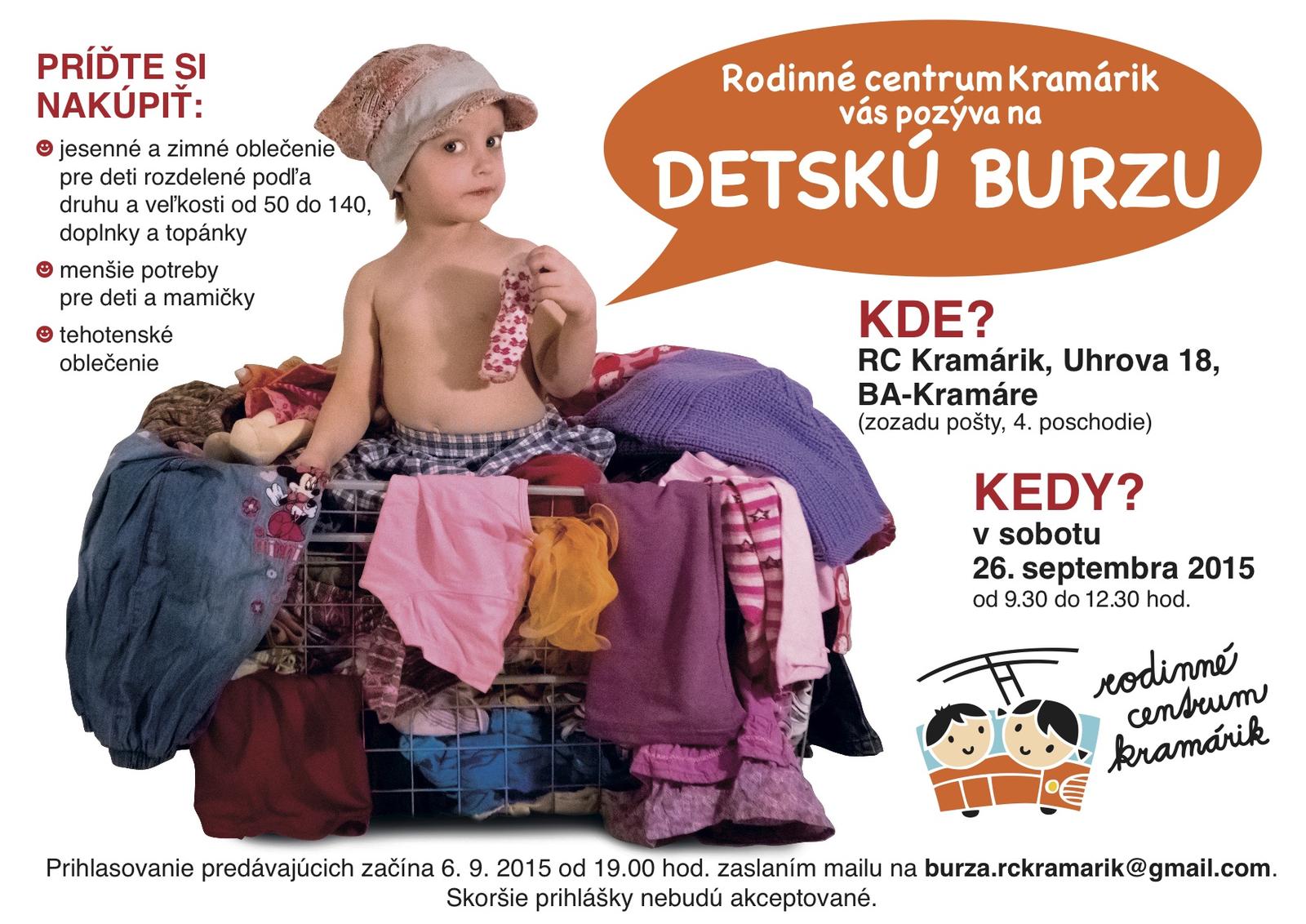 Uz tuto sobotu 26.9.2015 sa kona napr. aj vyborna burzicka v RC Kramarik - ja ju urcite navstivim, velmi sa mi pacili ich predosle burzy - prijemne, ciste a utulne prostredie, deticky sa hraju v detskom kútiku, zatial co maminy nakupuju, premysleny a vyborny system predaja, vsetky veci su prehladne roztriedene podla velkosti a hlavne tam vzdy nakupim za fantasticke ceny. Tak dovidenia na Kramaroch 26.9. od 9:30-12:30 hod. , Uhrova 18 🙂