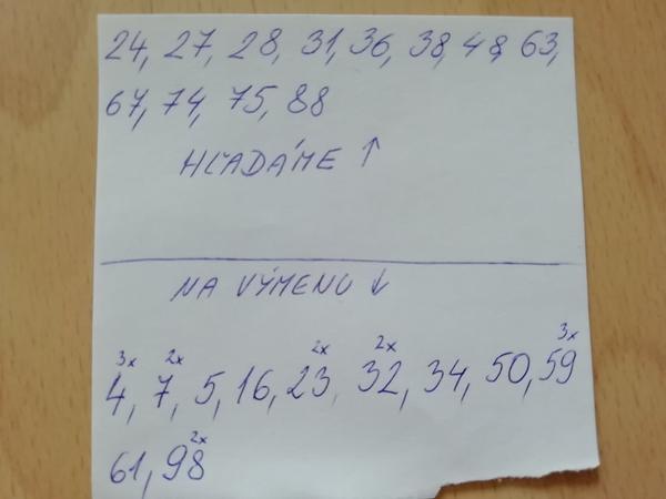 Ponúkam na výmenu: 2, 10, 17, 31, 37, 44, 45, 56, 58, 65, 65, 89. Chýba nám veľa, tak kľudne ponúknite.... ĎAKUJEM🙂