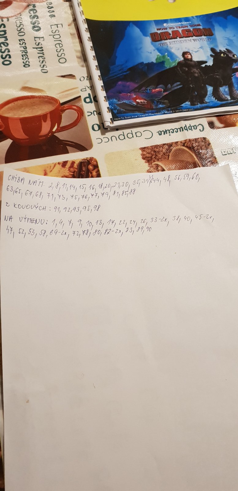 Chýba nám: 11, 19, 30, 33, 40, 41, 45, 50, 52, 62, 65, 66, 67, 70, 86, 91, 92, 93, 94, 95, 96, 97, 98, 99, 100
