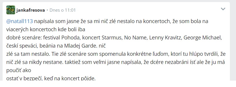 @jankafresova a ešte k tomu koncertu horkýže slíže,matka je v prvom rade vinna,že šla nepripravená na tento koncert,však snáď viem aká je to skupina kde idem na koncert a netrepem sa kde nezvladam situáciu