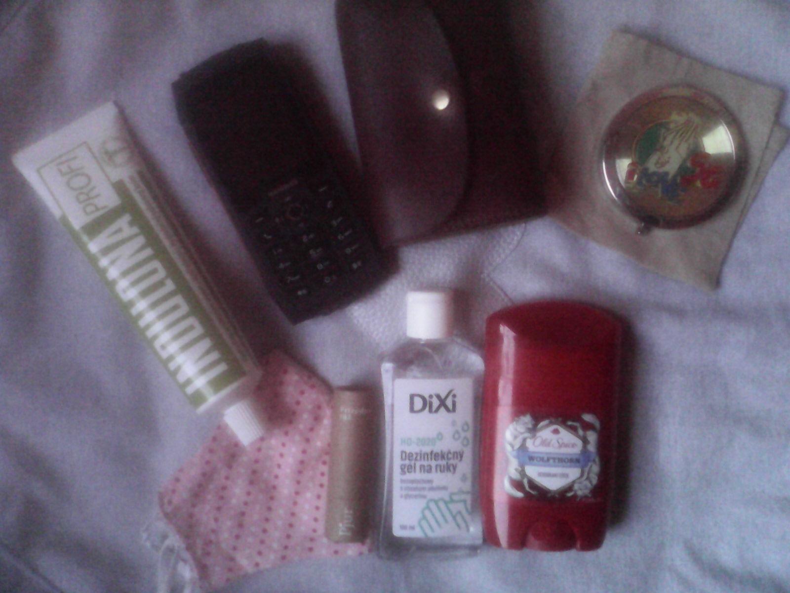 Penazenku, kluce, mobil, zrkadielko, ruz, balzam na pery, korektor, papierove vreckovky, par tamponov, aspon 1 tabletka proti bolesti, respirator a to je asi vsetko