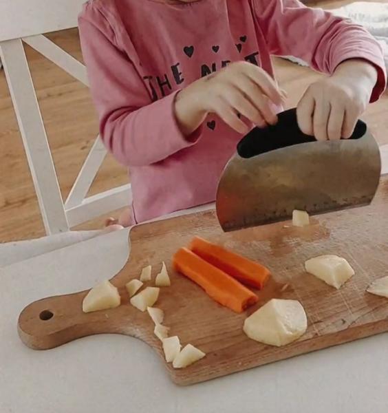 Nas ked sa zacal chytat "varenia" dostal priborovy a zuzlal ako zuzlal. Ziadne specialne som nekupovala. Neskor dostal skrabku na zemiaky a potom pod dozorom krajal normalnym. Myslim, ze mal 4 roky ked krajal cibulu na gulas na zahrade. Dostal najmensi aky bol a nakrajal ako vedel.