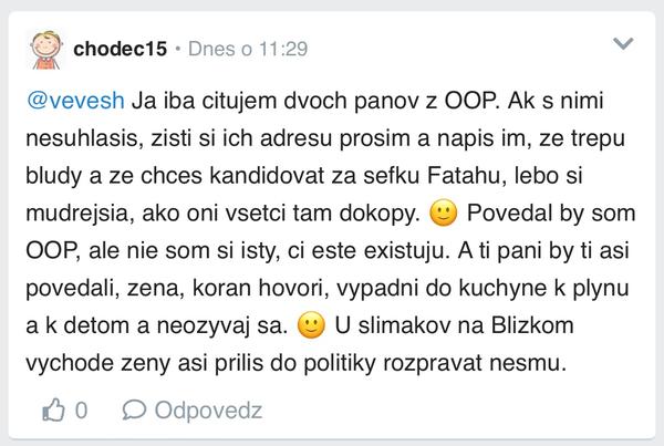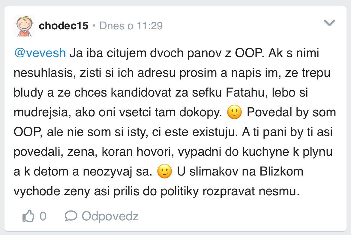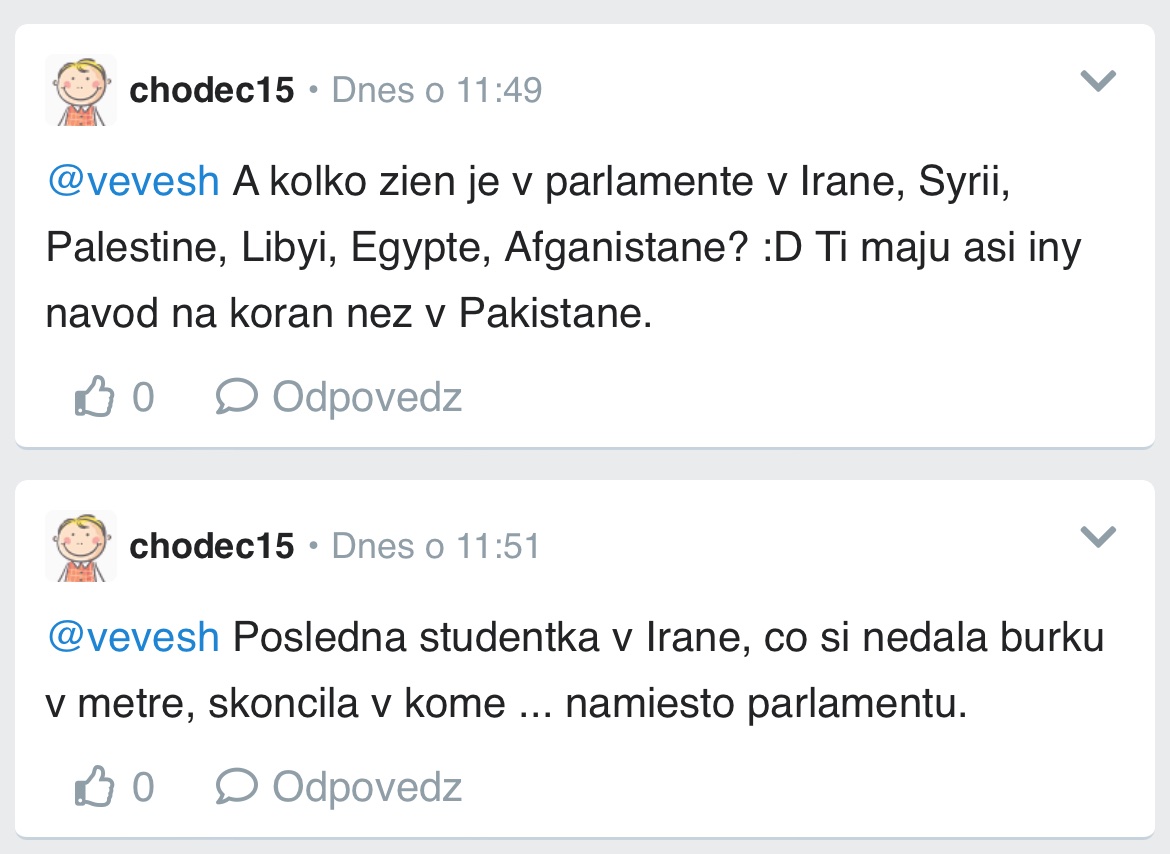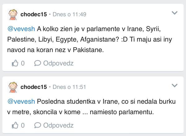 🤦🏼‍♀️ @vevesh tento pan je baran.. hovori, ze zeny “u arabo “ patria do kuchyne, nie do politiky. Ty mu povies, ze to tak nie je, lebo zeny su zastupene v politike. On ta vyzve napisat kolko ich je v istych krajinach. Ty mu das konkretne cisla a uvedies slovensky pomer pre porovnanie. Vychadza z toho, ze na slovensku je menej zien v politike ako “u arabov”. On ti na to povie, ze tym ze on nie je v politike sa nepovazuje za utlacaneho…