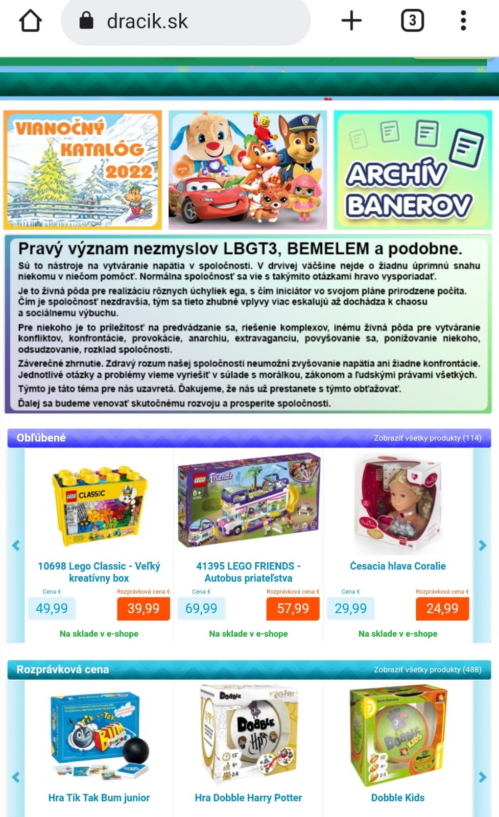 Co ti na tom vadi? Ze majitel svojho eshopu sa k niecomu vyjadri na svojej stranke? No a co,ze je to hrackarstvo..je to jeho,moze si tam dat co chce..a komu sa nepaci,nemusi stranku otvarat a moze si nakupit inde 🤷♀️ Jemu to az tak neublizi,ked 1% ludi nenakupi u neho,ale u konkurencie 🤷♀️
