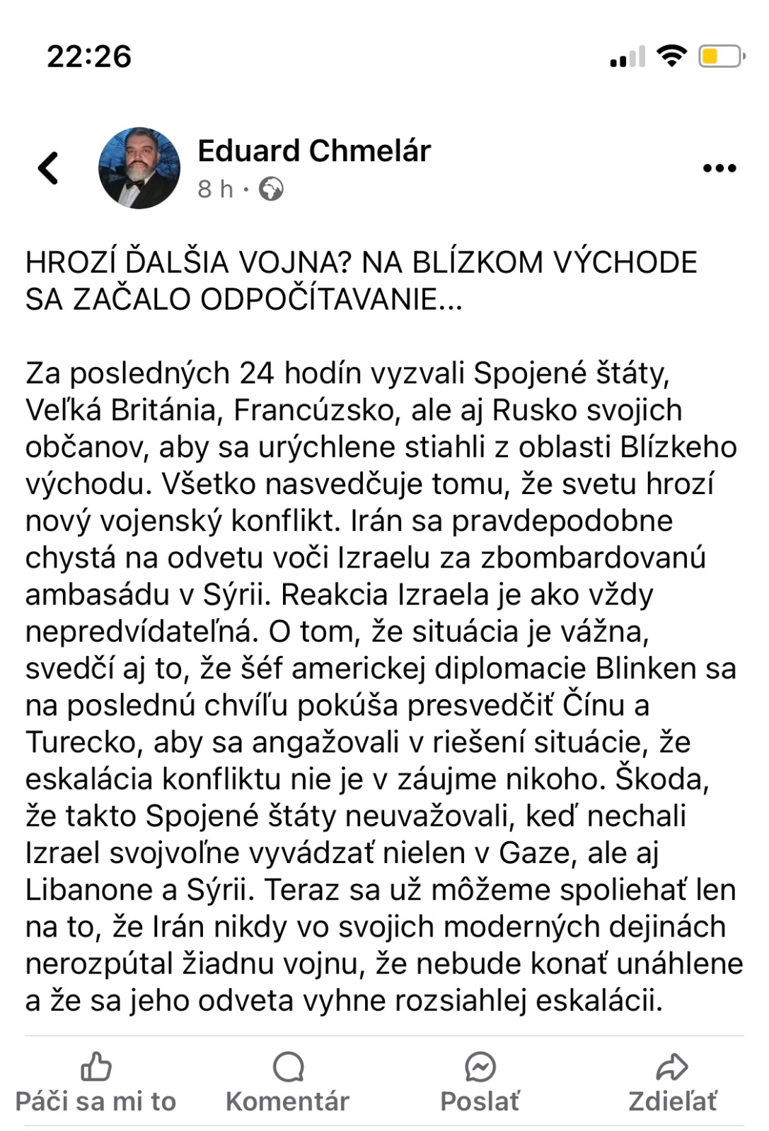 Bozeee,Chmelar zase raz po funuse. A samozrejme dobry mierumilovny Iran a zla bubu Amerika. Uz by sa mal dat liecit. Vsak uz tyzden sa o nicom inom nehovori. A ano,Iran zautoci na Izrael, americka flotila je uz v pohotovosti. Pravdepodobne dnes,zajtra. Uz od vcera Hezbollah pretazuje Izraelsky Iron dome strelami. Vsetky krajiny s okamzitou platnostou stahuju svojich ludi z Izraela aj Iranu. A co ma na stranke nase ministerstvo? Ze Izrael, druhy stupen nebezpecenstva zo 4 🤣🤣🤣.