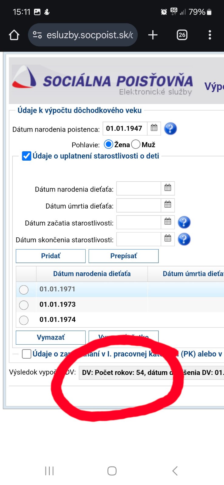 @tehulka2011 som ti to hodila do kalkulacky vypoctu dochodkoveho veku. Zena, tri deti, rok narodenia 1947. Odchod do dochodku je vek 54 rokov.