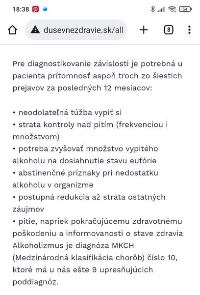 Môj muž si dáva polku piva každý večer. Nerobí mu problém jeden večer vynechať, napríklad kvôli šoférovaniu. Ale keď sme riešili, že dovolenku dáme úplne bez alkoholu (dva týždne), tak to mu fakt pokazilo náladu. Čiže - áno, môj muž je podľa všetkých definícií alkoholik 🤷😂. Keďže tú polku piva si dáva už dobrých 15 rokov, neprekáža mi to. A aby som nebola zlá, občas to vymení za víno so mnou. Ja som zas závislá na káve, keď ju nemám, bolí ma hlava a som veľmi náladová. Za mňa je to v pohode, aj keď je teda alkoholik. V takejto rovine a množstve mi to nevadí. (Aj s jedným pivom denne by som bola v pohode). A baby, vy sa na tom smejete, ale keď je ten prísun alkoholu pravidelný, tak naozaj sa podľa odborných definícií jedná o závislosť...