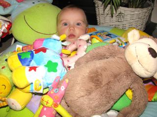 baby moja je hrozna jedoska, to je jej druhe meno! 😀 ked sa nechce hrat s hrackami, tak ich odhadzuje do stran, chvilku podrzi alebo da do pusy a sup odhodi. minule som ju posadila do jej somarika a oblozila vsetkymi hrackami co ma (pridavam foto) a ona ich vyhadzovala jednu po druhej, stopla som jej to, trvalo to presne 10 minut! 😀