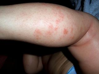Co sa tyka ekzemu, tazko povedat. Nasa mala ma vraj atopicky, je to takisto cervene, loziska kade tade, ale toto mi pride skor akoby v tom boli male pupaciky, tazko to z foto spoznat. Nasa mala nema take pupacikovite. Takze neporadim. Ale ... ak je to aj suchsie, mame olej do kupela, super vec a co nam teraz namiesali 2 nove maste (stare uz nepomahali), tak zakladom jednej je Advantan krem a druhej je Belogent, oba mastne kremy. Nasa mala to ma totizto cervene a suche ... a na kozne vas neposlal?