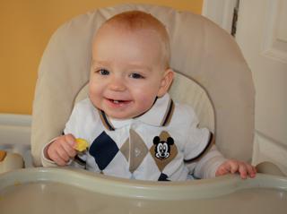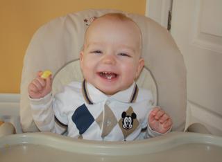 @hori NO my mame uz 7 zubkov, hore 4 a dole 3, tak veru pozuje. Davam mu ked chcem aby papal krasne, do pusinky a zapija to cajikom, ked chcem sa aj ja najest, dam mu to do ruky a on si odhryza,ale je to potom vsade.