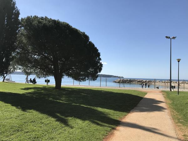 Novigrad - plaz pri Aminess Maestral. Fotené dnes, podľa mna super pre deti, pozvolný vstup, okolo hotela park, trávička a na rovinke. Hotel je bezbariérový.
