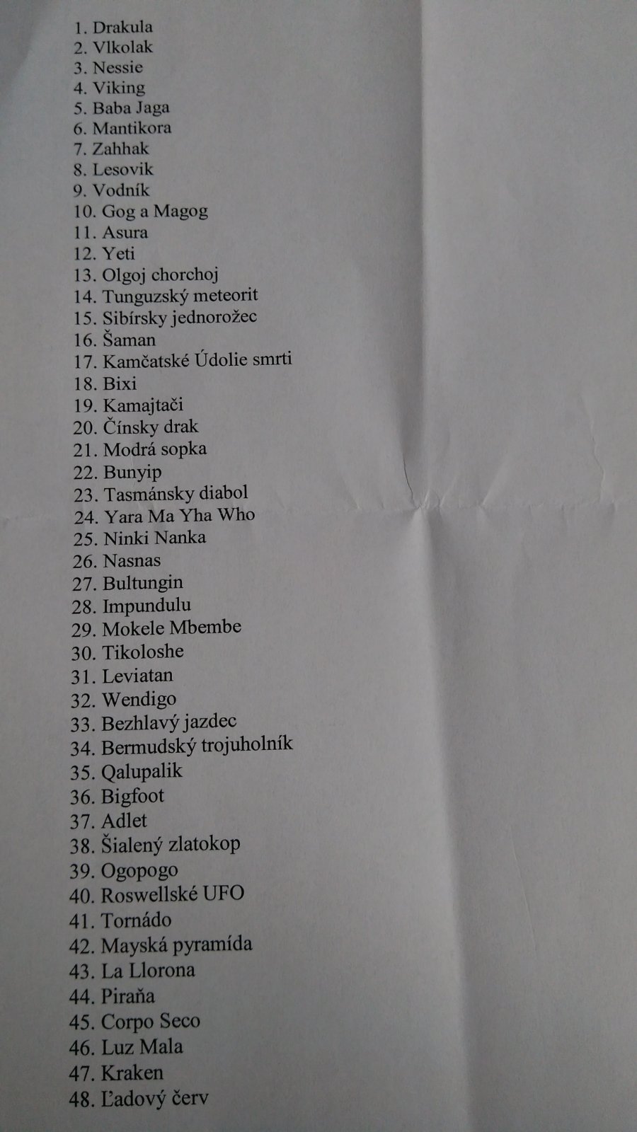 Dobrý deň, potrebujeme: Vlkolak, Nessie, Mantikora, Lesovik, Vodnik, Olgoj Chorchoj, Tinguzski Meteorit, Bixi, Ninki Nanka, Mokele Mbenbe, Tikoloshe, Bermudský trojuholník, Šialený Zlatokop, Mayská pyramída, Ľadový červ. Na výmenu máme tieto: