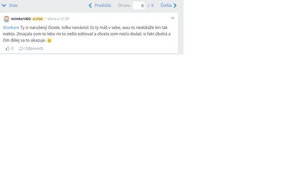 Som z teba ako človeka maximálne sklamaná, považovala som ťa za viac inteligentného človeka a nie za takého zatrpknuteho. Nemám viac slov. Namiesto slušného ospravedlnenia neustále sa do mňa púšťaš. Žiadne prepáč, nič. Len ďalej pokračuješ.