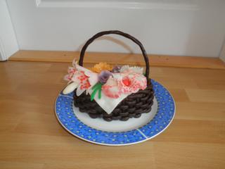 Dnešní dort, poprvé jsem dělala košík. Ucho jsem jenom tak vytvarovala z hmoty a nemotala jsem, protože jsem dnes ráno upekla korpus a rozhodla se dort udělat. Dodělala jsem ho jak malý spal po obědě, ale kytičky jsem měla hotové od včerejška.