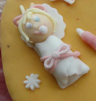 @katulkaaaaaa - bábo sa dá aj vymodelovať. Ja sa robila takto: Vykrojila som si malé koliečko, také to ozdobne(vyzerá ako kvietok z veľa ľupeňmi) a vyrezala obdlžniček. Potom som si urobila malú hlavičku a valček z slabo oranžovej hmoty. Na hlavičku sa urobí tvárička,(môže sa aj namaľovať, ja som vtedy ešte nemala farby ani kostice) prilepia vlásky a nalepí sa na koliečko. Valček sa zabalí do obdlžnika(do kríža) a prilepí ku koliesku s hlavičkou. Nakoniec sa na perinku pridá mašlička a bábo je hotové =)