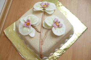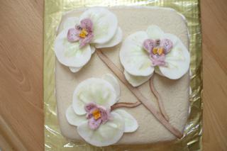 Tak právě dokončený dort pro kámošku, ty orchidejky mě ale potrápily i při tom lepení na dort, jak je to zatvrdlé, tak se to moc láme.... ten SFV je docela křehký... snad to bude držet hodinu cesty autem 😲 potah je mmf z karamelových bonbonů, není to barvené, vyzkoušela jsem si otlačit struktur folii, ale moc to nešlo a při uhlazování se mi to na některých místech smazalo, tak příště raději ne na celý povrch, ale jen na nějakou menší část.....