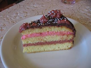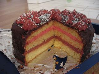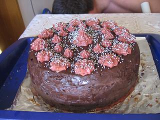 Ahojky, tak první dortík za sebou. není moc povedený. čokoláda se mi táhla při roztírání, korpus při pečení naskočil do kopečku, že jsem musela seříznout vršek. .. no, pomáhal i manžel, abych s tím netřískla o zem.