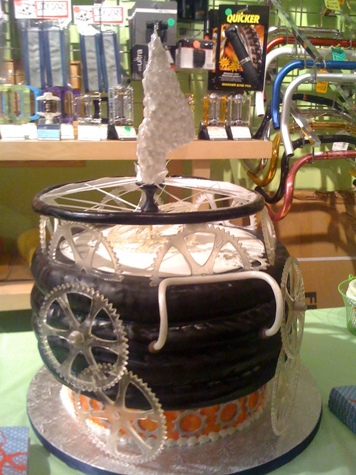 druhe bolo robila tortu ruzovo fialovu-kuzelky ,pak krivú "potetovanui" pre tattera na zasnuby a taku plachenicu ako prekvapko pre zenicha na svadbu a este robili pre cyklo obchod take hmmm..divne 😀 akoze kolesa od bicyklov na sebe prosto len cierne pneumatiky ci ako sa to vola na sebe a hore polozene koleso robene z toho isomaltu a take ozubene kolieska tam este boli 😀