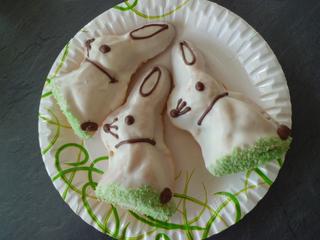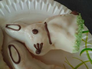 Cesto je velmi podobne ako na muffiny ,su obliaty riedsou bielou cokoladou. Ocka, uska , nostek a fuziky su zdobene mliecnou cokoladou a na spodku akoby travicka je na zeleno zafarbeny kokos.