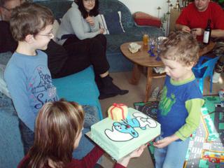 Ahojte děvčata, vůbec vás kvůli daním nestíhám... Jen Vám se dávám obrázek dortíku pro synovce - ne příliš povedený Šmoula Šprýmař... Ale oslavenec ho poznal, tak aspoň tak... Ten balíček je dárek dortíček pro švagra, který měl narozeniny v lednu...