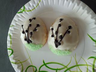 No ale ako ispiracia pre menej zrucne nepernikove zienky si myslim , ze su celkom pekne.Cesto podobne ako muffiny, poliate bielou cokoladou a zdobene mliecnou, Travicka je na zeleno nafarbeny kokos.