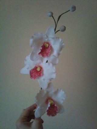 Snažila som sa urobiť moju prvú orchideu na drôtiku - akože je veľmi úbohá - neviem prečo, ale nedržia mi tie kvety, v piestiku sa mi to stále točí a nedrží, na jednej sa mi ešte k tomu pri viazaní flor. pásky drôtik predral zpredu z piestika von 😠