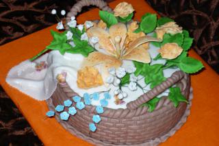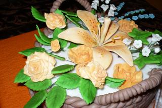 salkový krém jsem dělala znovu, čokoládový jsem zachránila, ale budu trnout při krájení, jestli se nesrazil ještě znovu v dortu. Z některých kytiček mi upadaly lístky...ale už vím, kde jsem dělala chybu, drátek musím nejdřív pomatlat lepidlem před zapíchnutí do lístku, tak příště no.....